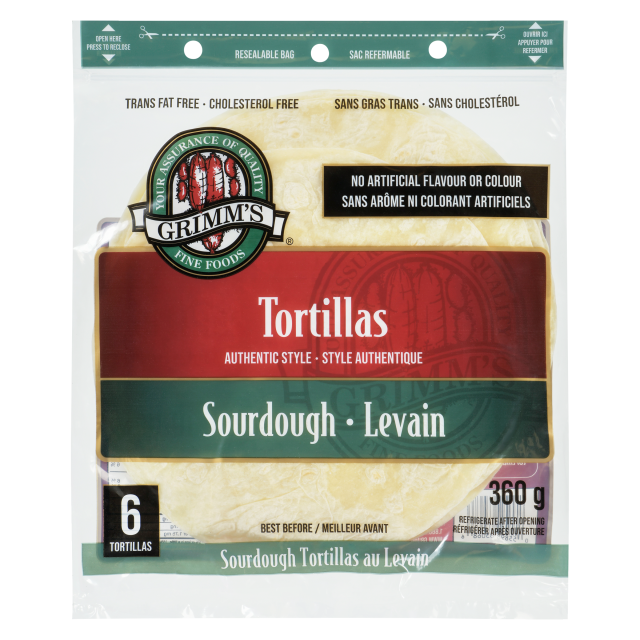 Enjoy the tangy taste you love about sourdough bread—in a lighter, flexible tortilla. Grimm’s Sourdough Tortillas are gut health friendly, trans fat free, and made with no artificial flavours or colours.